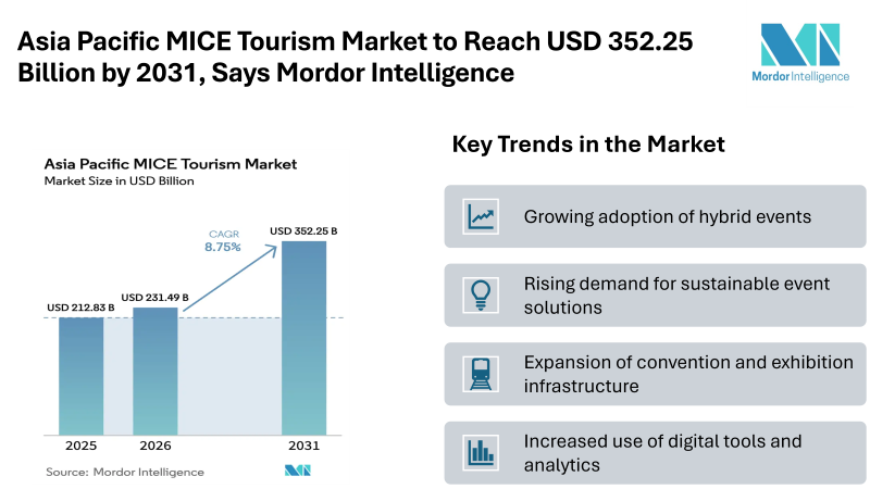According to Mordor Intelligence, the Asia Pacific MICE Tourism Market size is expected to grow from USD 212.83 billion in 2025 to USD 231.49 billion in 2026, and further reach USD 352.25 billion by 2031, registering a CAGR of 8.75%. This steady market growth reflects improving corporate confidence, increasing international collaboration, and the return of large-scale meetings and exhibitions. The industry is benefiting from a balanced mix of domestic and cross-border events, as companies continue to rebuild engagement strategies after pandemic disruptions. Countries across the region are investing in modern venues, expanding airline connectivity, and simplifying event logistics to attract global organizers. At the same time, planners are focusing on cost efficiency and flexibility, which is encouraging the adoption of hybrid formats that combine physical and virtual participation.
