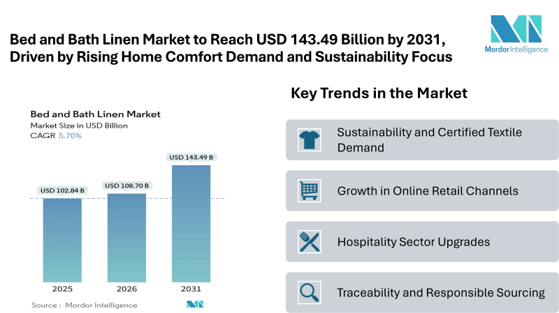 According to Mordor Intelligence, the bed and bath linen market size is projected to grow from USD 102.84 billion in 2025 to USD 108.70 billion in 2026, reaching USD 143.49 billion by 2031, at a CAGR of 5.70% during the forecast period. The market growth is supported by steady demand from households, hospitality upgrades, and increasing consumer attention toward comfort and quality in home textiles.