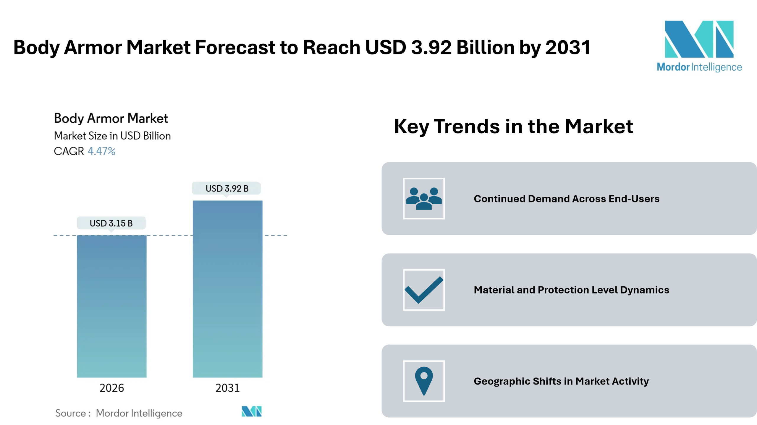 The body armor market size stands at USD 3.15 billion in 2026 and is projected to reach USD 3.92 billion by 2031, representing a 4.47% CAGR, according to recent industry analysis by Mordor Intelligence. This reflects continued interest across defense forces, law enforcement agencies, and civilian segments for protective equipment that balances weight, protection, and comfort. Rising personal and institutional safety needs, along with ongoing military modernization efforts in several regions, contribute to sustained Body Armor Market growth through the forecast period.