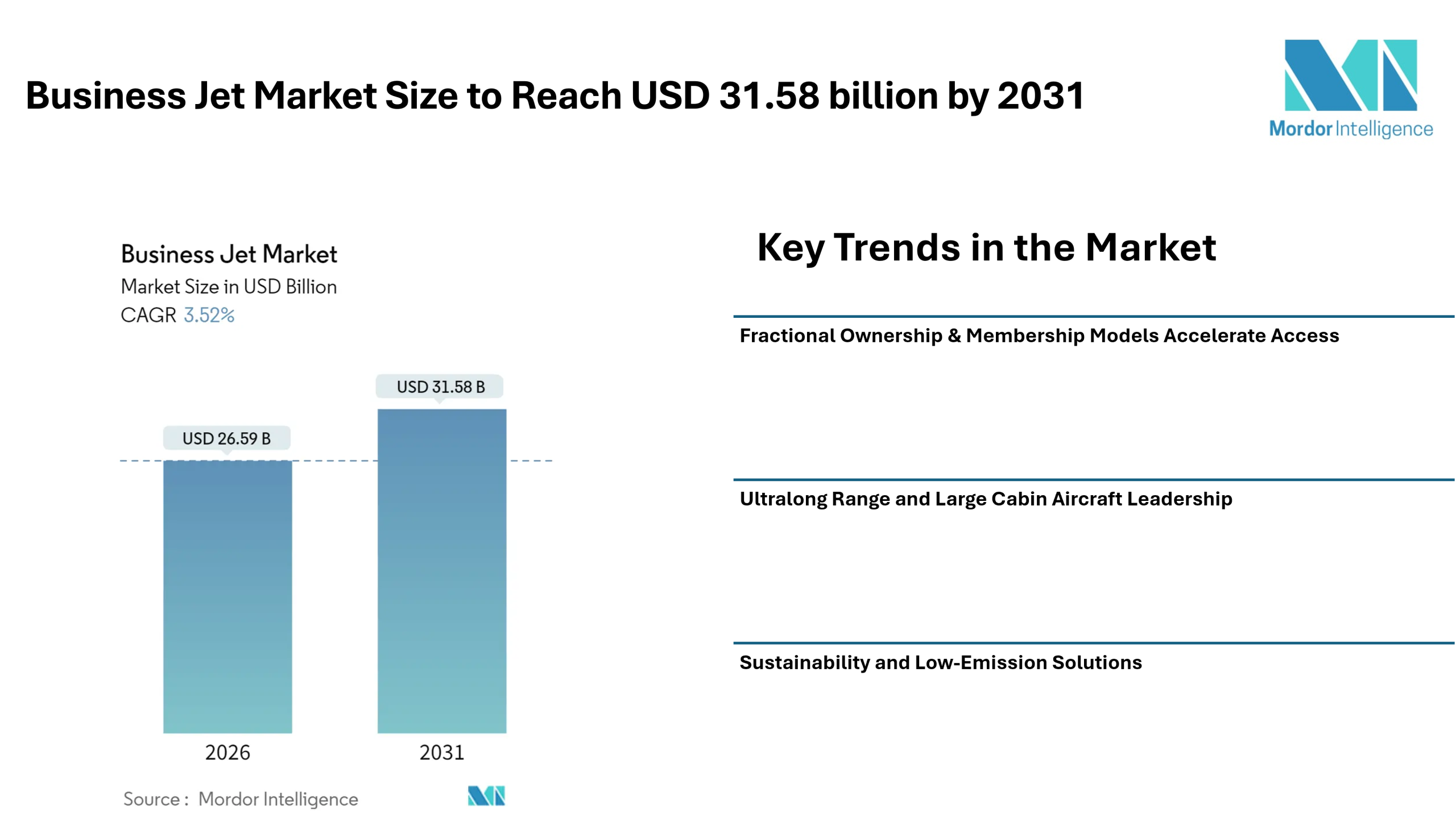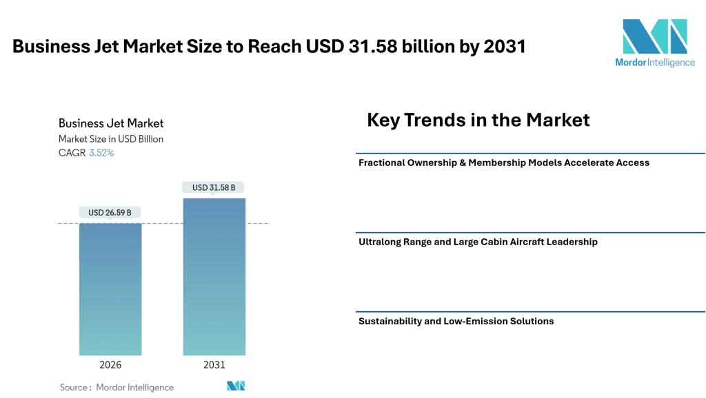 The business jet industry continues its steady expansion as global mobility needs evolve and demand for private air travel rises. The business jet market size is estimated at USD 26.59 billion in 2026 and is projected to reach USD 31.58 billion by 2031, representing a CAGR of 3.52% during 2026–2031.