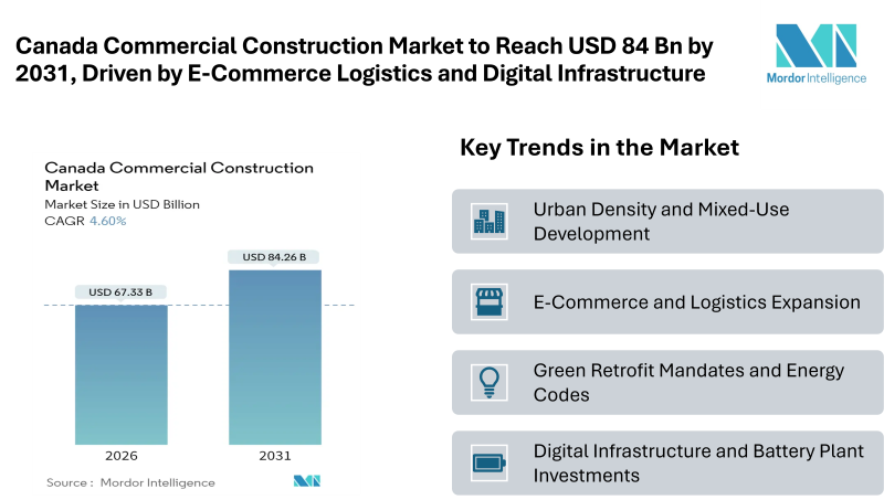 According to industry analysis, the Canada commercial construction market size is projected to grow from USD 64.37 billion in 2025 to USD 67.33 billion in 2026, and further reach USD 84.26 billion by 2031, registering a 4.60% CAGR. The Canada commercial construction market is set to expand steadily over the forecast period, reflecting balanced demand across office, retail, industrial, and mixed-use developments.