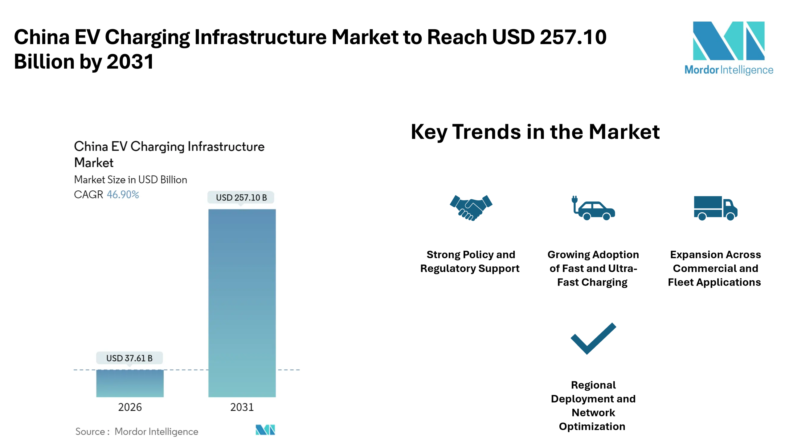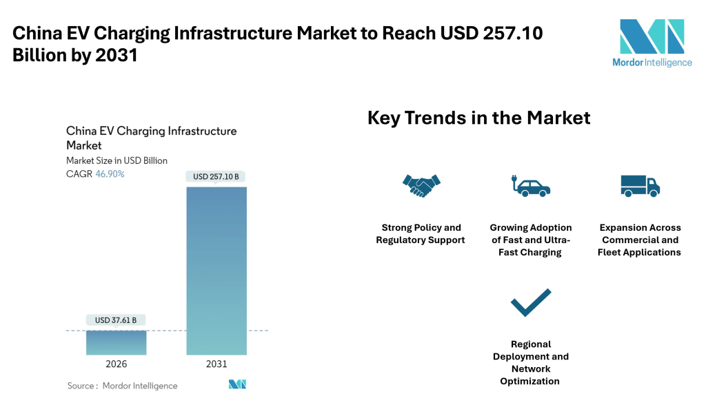 The China EV Charging Infrastructure Market is witnessing rapid expansion, supported by strong government policies, accelerating electric vehicle adoption, and large-scale investments in charging networks across urban and highway corridors. The market size is estimated at USD 37.61 billion in 2026 and is projected to reach USD 257.10 billion by 2031, registering a CAGR of 46.90% during the forecast period