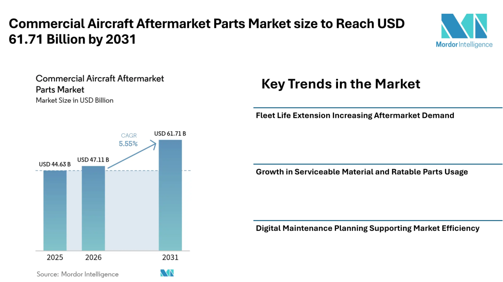 Commercial Aircraft Aftermarket Parts Market size to Reach USD 61.71 Billion by 2031 as Fleet Life Extension and Predictive Maintenance Influence Market Trends – Mordor Intelligence