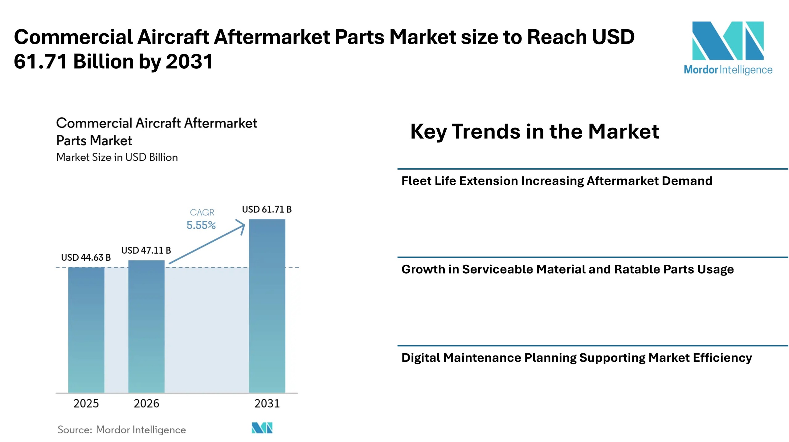 Home»NEWS»PRESS RELEASES»Commercial Aircraft Aftermarket Parts Market size to Reach USD 61.71 Billion by 2031 as Fleet Life Extension and Predictive Maintenance Influence Market Trends – Mordor Intelligence