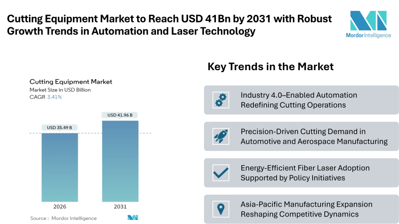 According to Mordor Intelligence, the cutting equipment market size was valued at USD 34.32 billion in 2025 and is projected to expand from USD 35.49 billion in 2026 to USD 41.96 billion by 2031, registering a CAGR of 3.41% over the forecast period from 2026 to 2031. Market growth is being supported by continued investments in advanced cutting technologies, increasing adoption of automated manufacturing processes, and the development of equipment capable of handling a broader range of materials. Despite signs of market maturity, demand remains resilient as industries prioritize precision, productivity, and operational efficiency.
