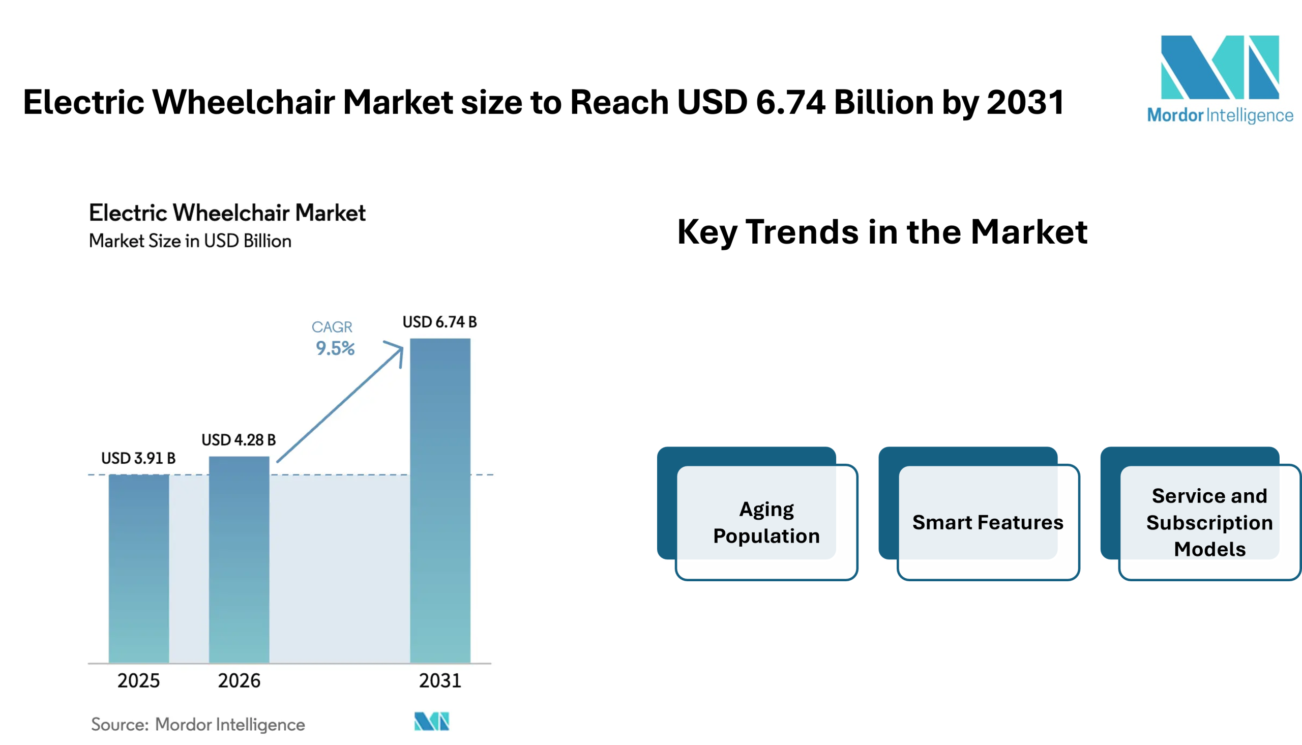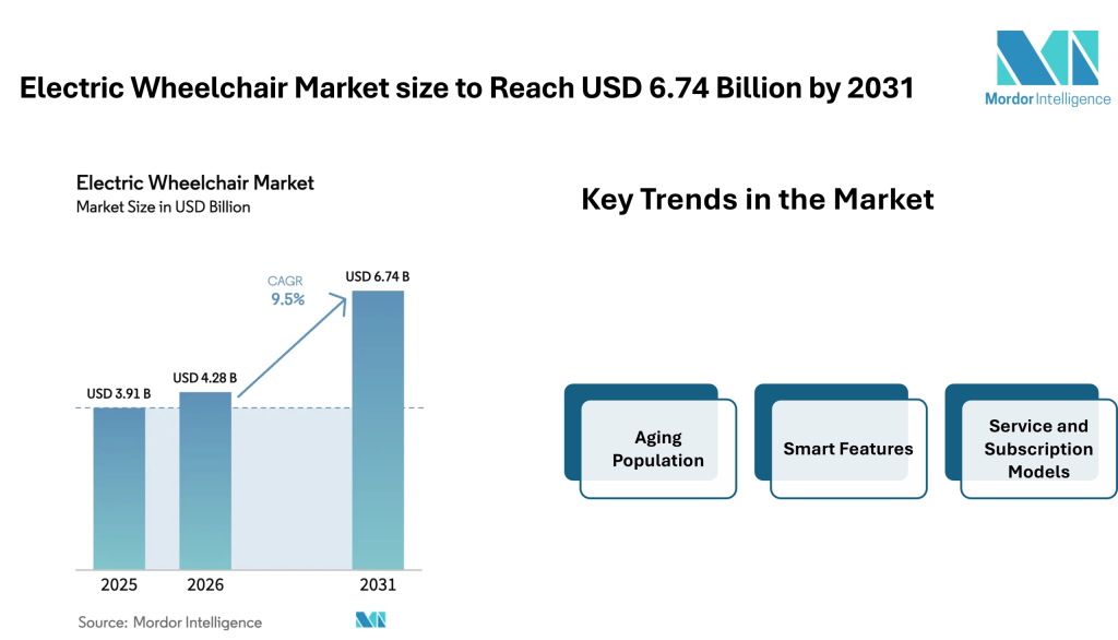 According to Mordor Intelligence, the electric wheelchair market size is estimated at USD 4.28 billion in 2026, rising from USD 3.91 billion in 2025, and is projected to reach USD 6.74 billion by 2031, reflecting a steady expansion with a 9.5% CAGR during the forecast period. These figures highlight the steady electric wheelchair market growth supported by demographic changes, healthcare needs, and improvements in assistive mobility equipment.