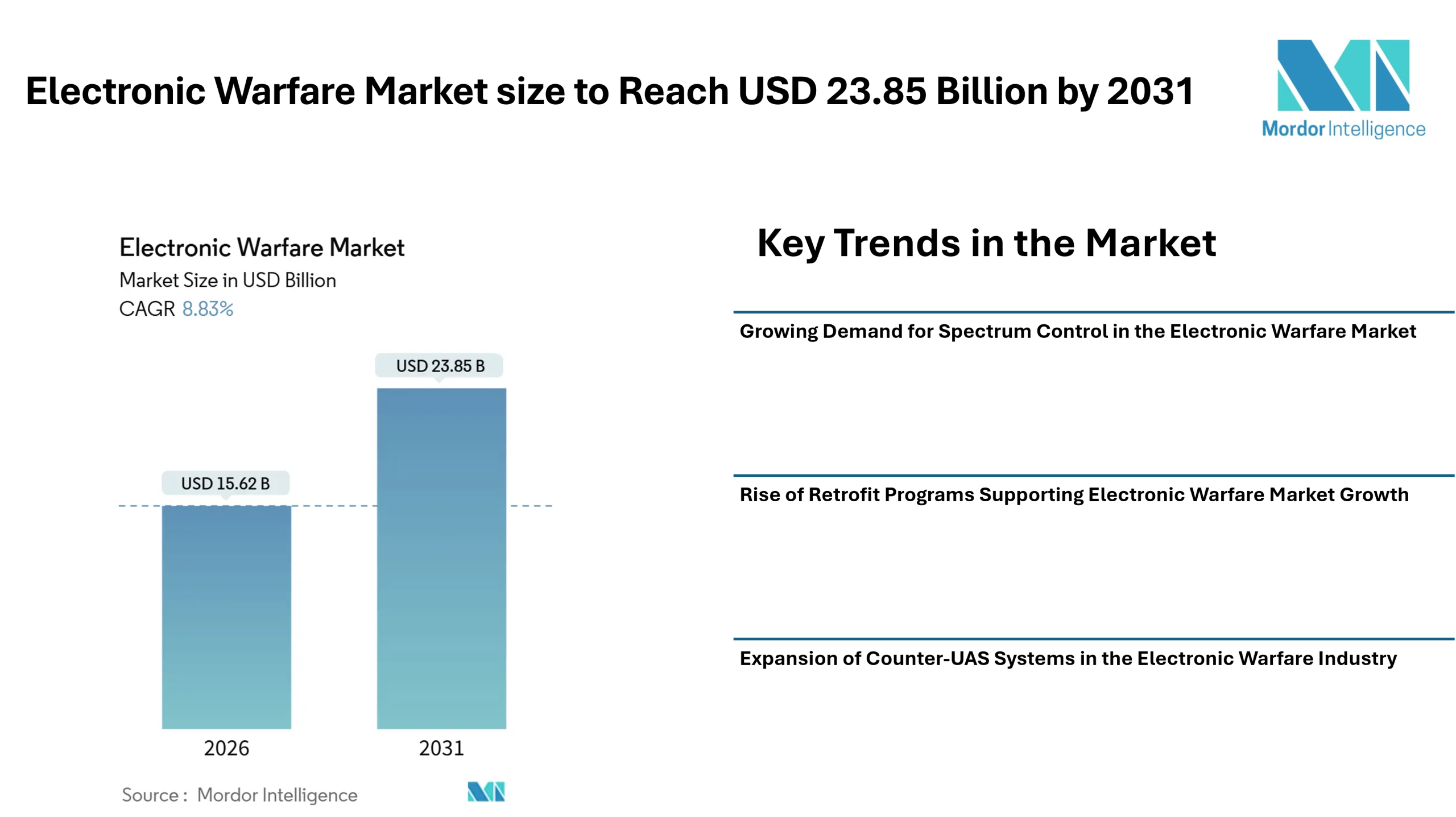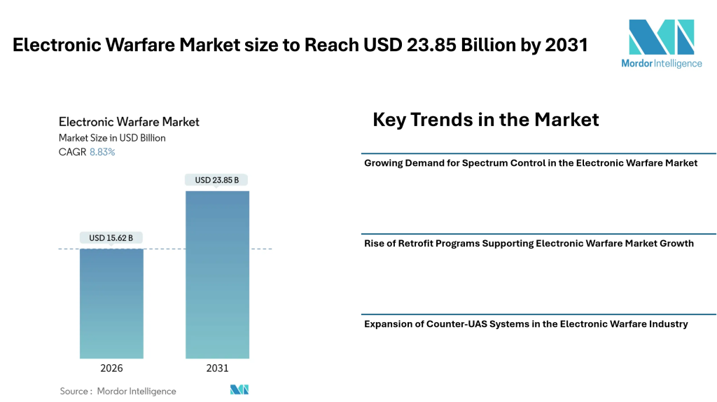 According to Mordor Intelligence, the electronic warfare market size reached USD 15.62 billion in 2026 and is projected to grow to USD 23.85 billion by 2031, reflecting steady expansion across multiple defense segments.