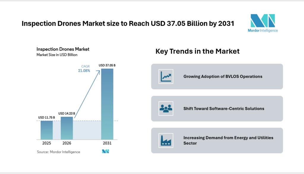 According to Mordor Intelligence, the inspection drones market size was valued at USD 11.75 billion in 2025 and is expected to grow from USD 14.23 billion in 2026 to reach USD 37.05 billion by 2031, reflecting consistent inspection drones market growth during the forecast period.