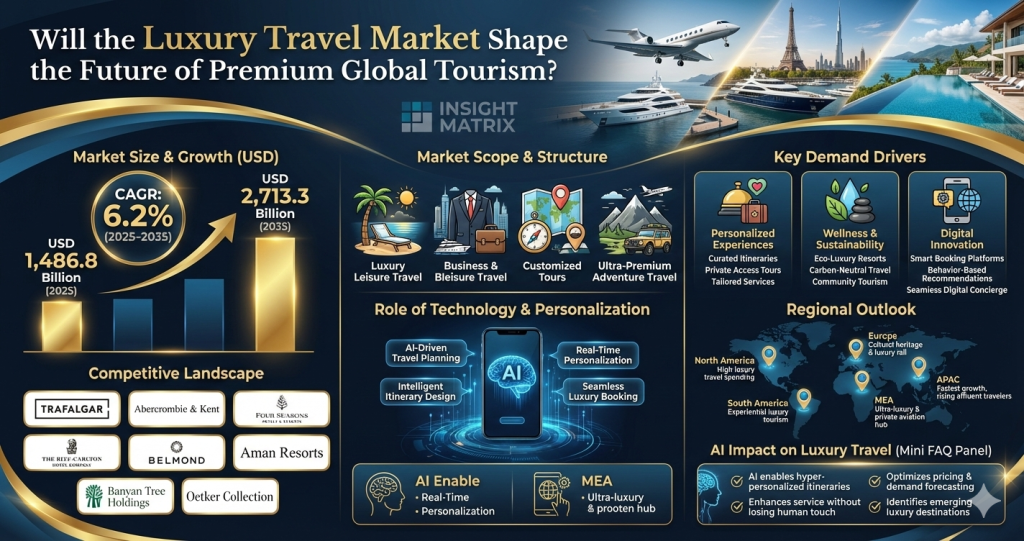 The global Luxury Travel Market is experiencing remarkable growth as high-income travelers increasingly seek personalized, immersive, and exclusive travel experiences. According to recent market insights, the Luxury Travel Market size is projected to grow from USD 1486.8 billion in 2025 to USD 2713.3 billion by 2035, registering a compound annual growth rate (CAGR) of 6.2% during the forecast period (2025–2035). The growth is largely driven by rising disposable incomes, evolving consumer preferences, digital innovation in travel services, and the increasing popularity of experiential tourism.