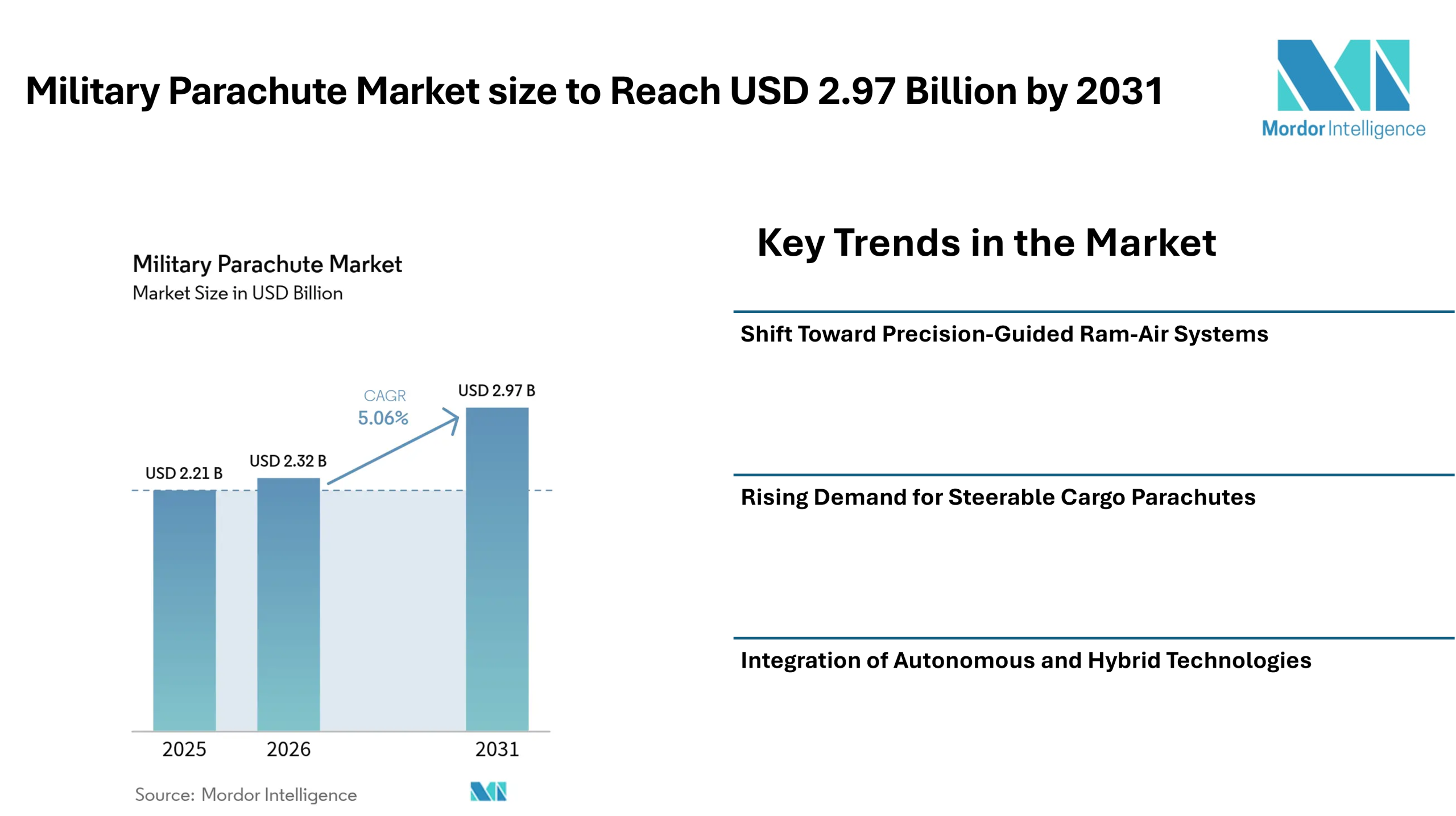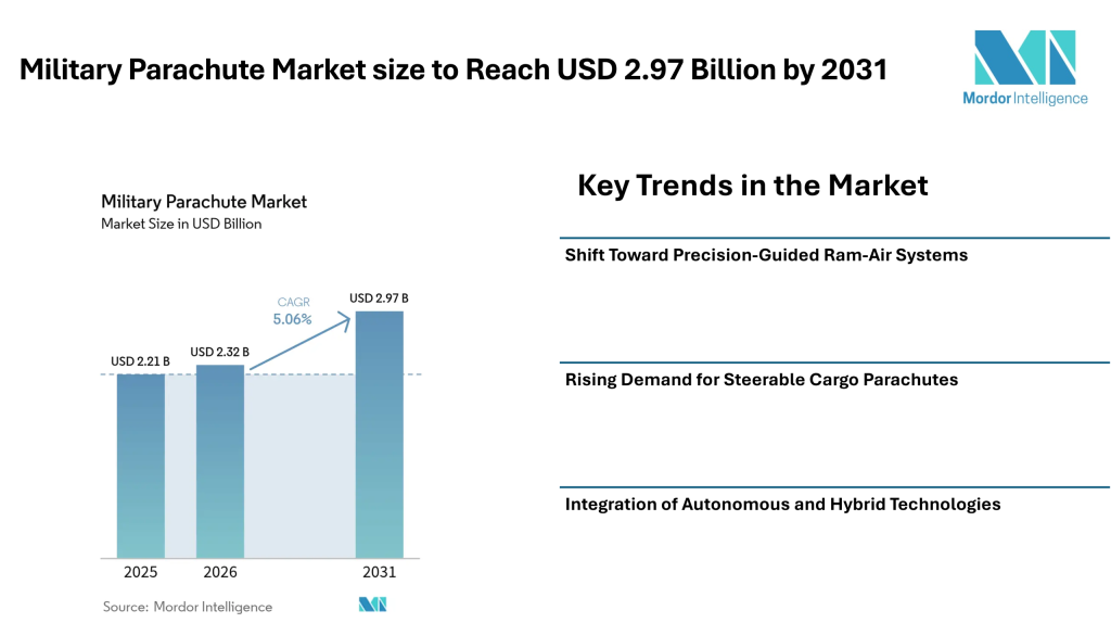 According to Mordor Intelligence, the military parachute market size was valued at USD 2.21 billion in 2025 and is projected to grow to USD 2.97 billion by 2031, reflecting consistent military parachute market growth during the forecast period. This upward trajectory reflects increased procurement cycles supported by rising defense budgets across NATO countries and the Indo-Pacific region.