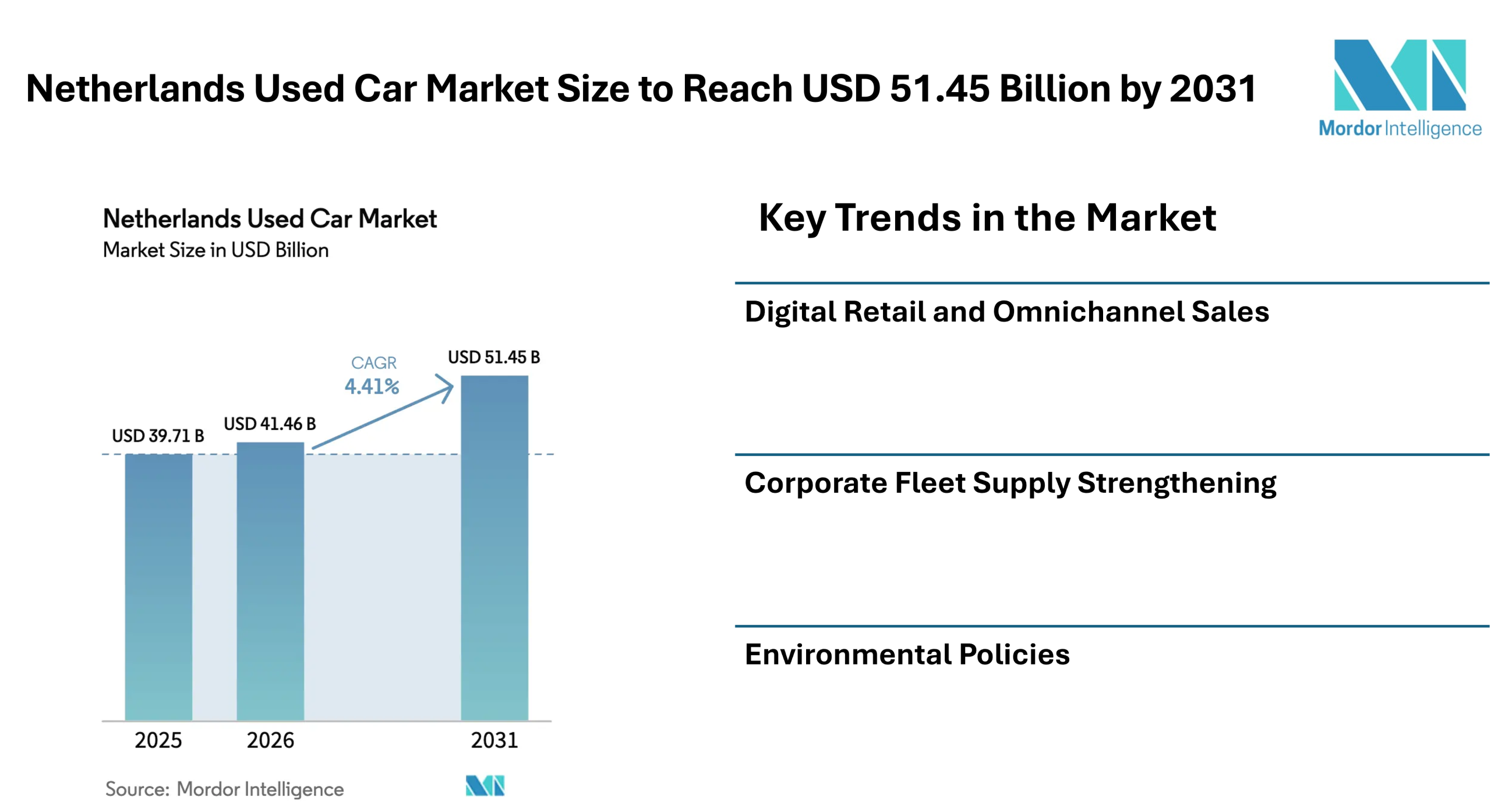 According to Mordor Intelligence, the Netherlands used car market size was valued at USD 39.71 billion in 2025 and is expected to reach USD 41.46 billion in 2026, with projections indicating the market could reach USD 51.45 billion by 2031. This outlook reflects stable demand across passenger vehicle categories and an active resale ecosystem supported by digital platforms and organized dealer networks.