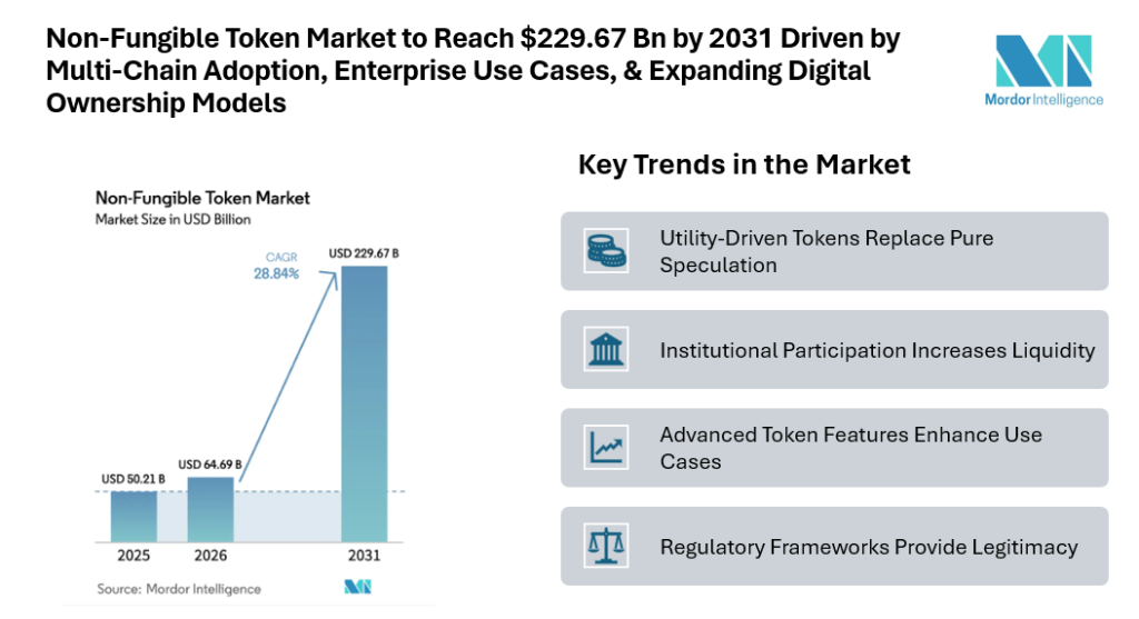 According to Mordor Intelligence, the non-fungible token market is projected to grow from USD 50.21 billion in 2025 to USD 64.69 billion in 2026 and is forecast to reach USD 229.67 billion by 2031, registering a CAGR of 28.84% during 2026–2031. This strong market growth reflects increasing adoption beyond speculative trading toward practical applications such as verified ownership, customer engagement, and supply-chain authentication. The token market is entering a new phase of expansion as digital ownership becomes part of mainstream commerce, entertainment, and brand strategy