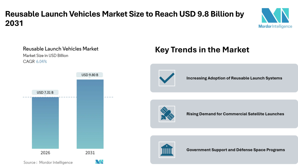 The Reusable Launch Vehicles market is witnessing steady growth as space agencies and commercial launch providers increasingly adopt reusable systems to reduce launch costs and improve mission efficiency. According to Mordor Intelligence, the market was valued at approximately USD 7.31 billion in 2026 and is projected to reach around USD 9.8 billion by 2031, growing at a CAGR of about 6.04% during the forecast period.