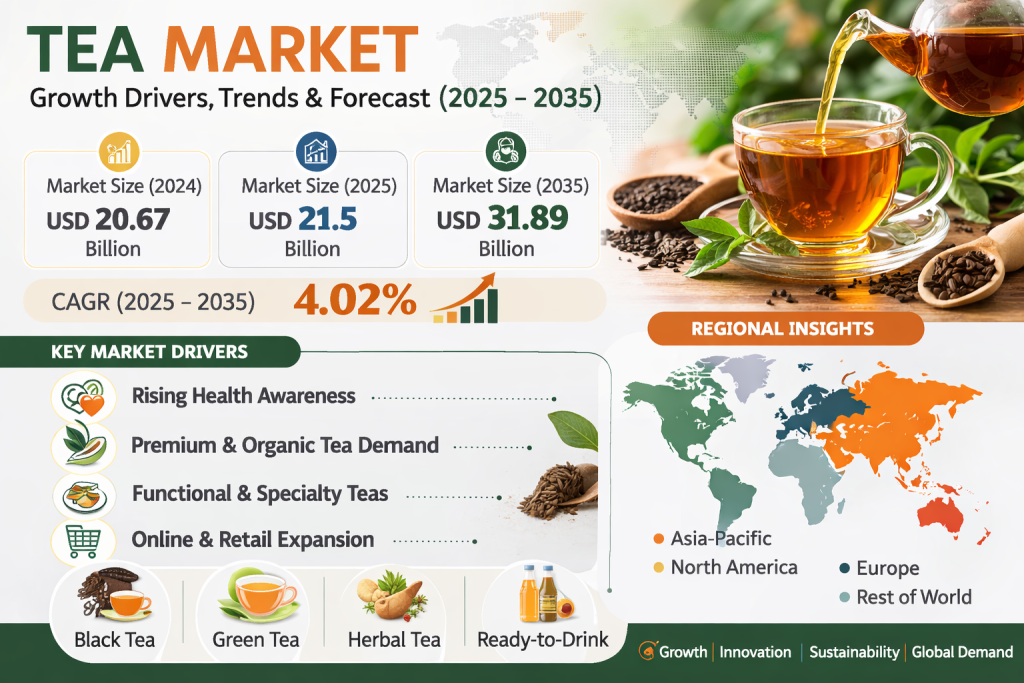 The global Tea Market continues to experience steady growth driven by changing consumer preferences, increasing health awareness, and rising demand for premium beverages. Tea remains one of the most widely consumed drinks worldwide after water, and its cultural importance across regions such as Asia, Europe, and the Middle East sustains strong global demand. According to MRFR, the Tea Market size was valued at USD 20.67 billion in 2024 and is expected to reach USD 21.5 billion in 2025. By 2035, the market is projected to grow to USD 31.89 billion, registering a compound annual growth rate (CAGR) of 4.02% during the forecast period (2025–2035).