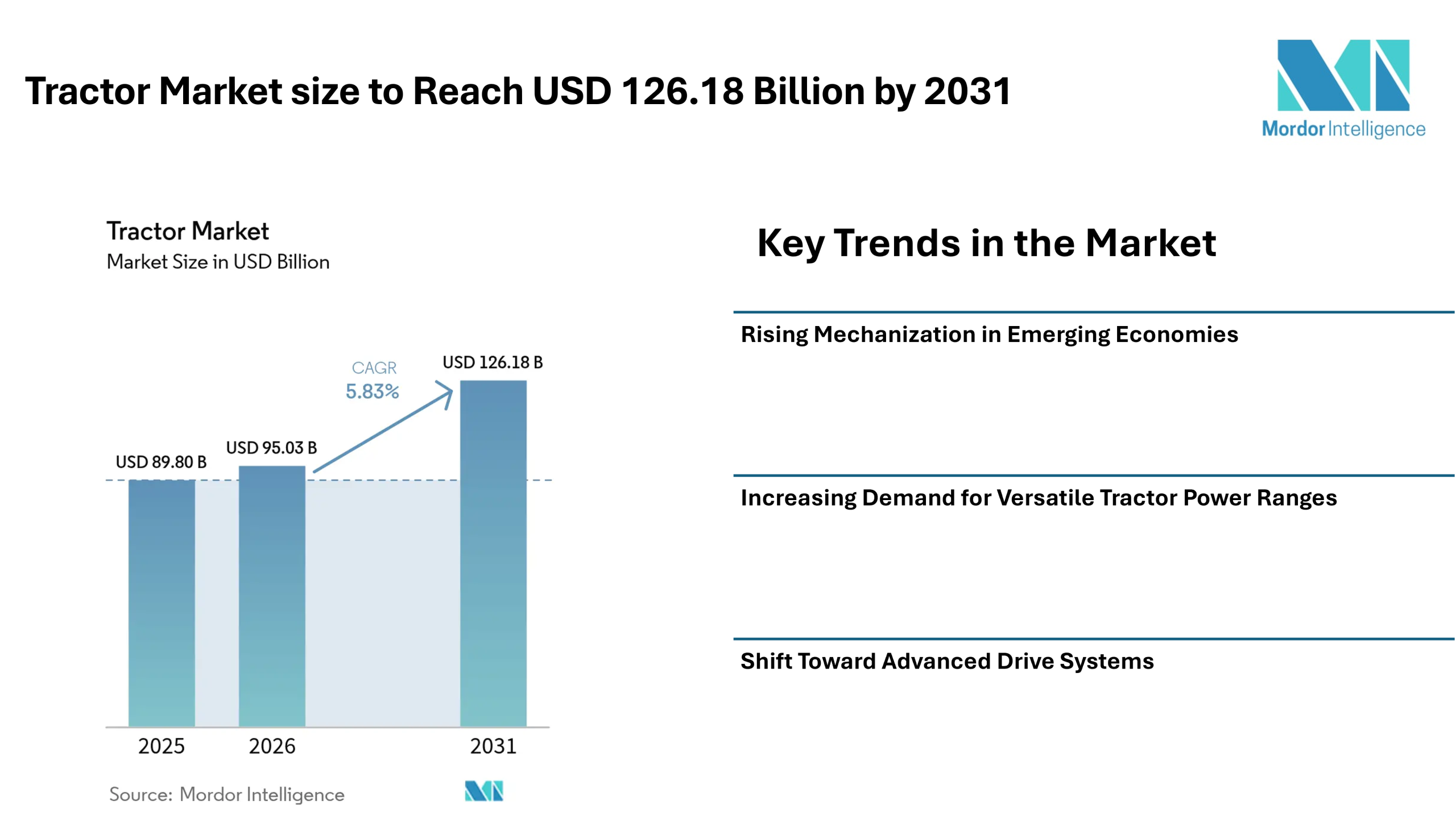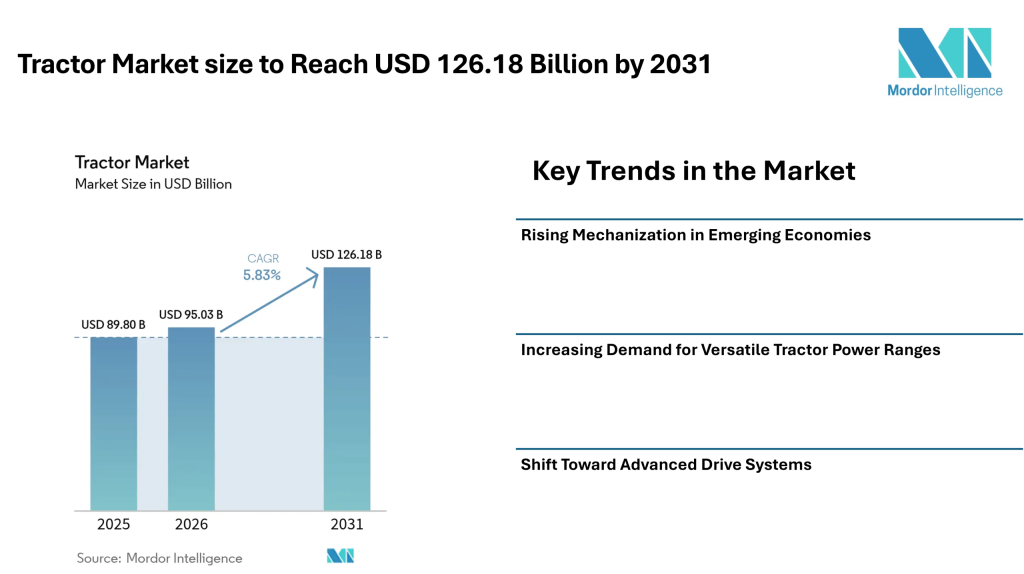 According to Mordor Intelligence, the tractor market size is estimated at USD 95.03 billion in 2026, increasing from USD 89.8 billion in 2025, and is projected to reach USD 126.18 billion by 2031, registering a CAGR of 5.83% during the forecast period.
