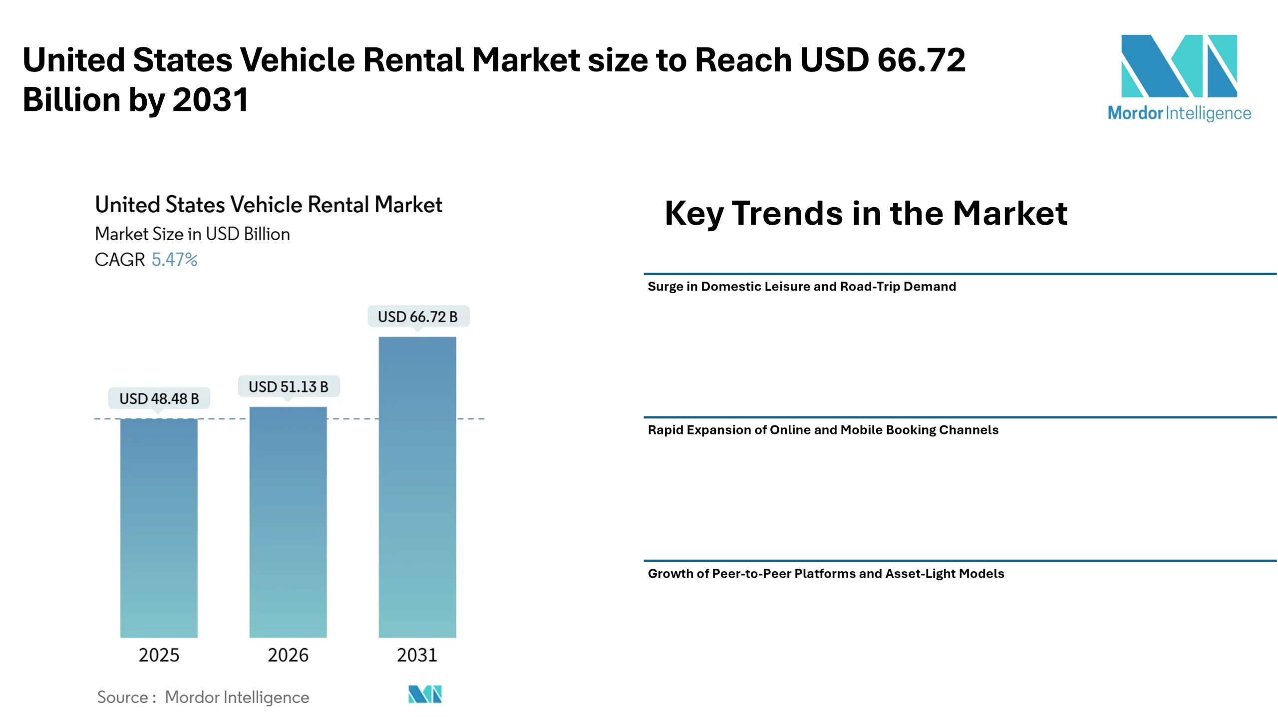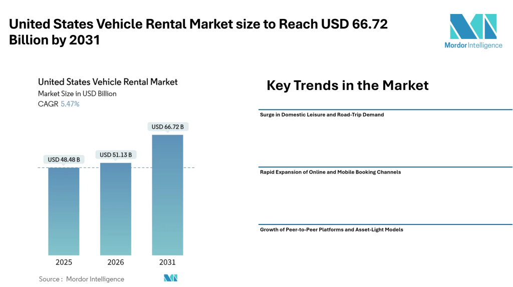 According to Mordor Intelligence, the United States vehicle rental market size is projected to grow from USD 48.48 billion in 2025 to USD 51.13 billion in 2026 and is expected to reach USD 66.72 billion by 2031, registering a CAGR of 5.47% during the forecast period. The United States vehicle rental market forecast reflects steady expansion supported by leisure travel recovery, hybrid work patterns, and a rising shift toward digital platforms.